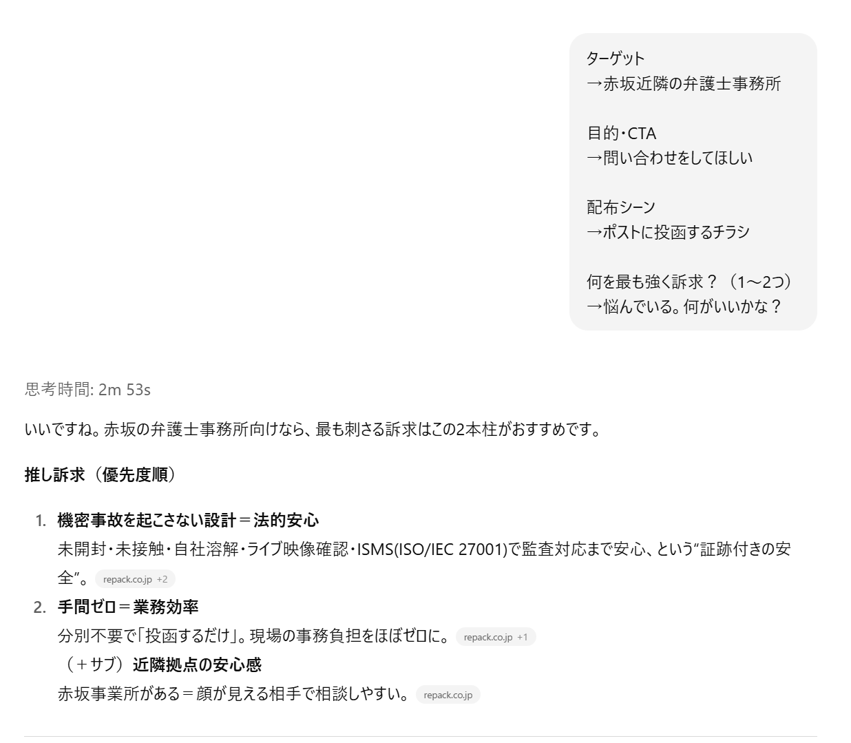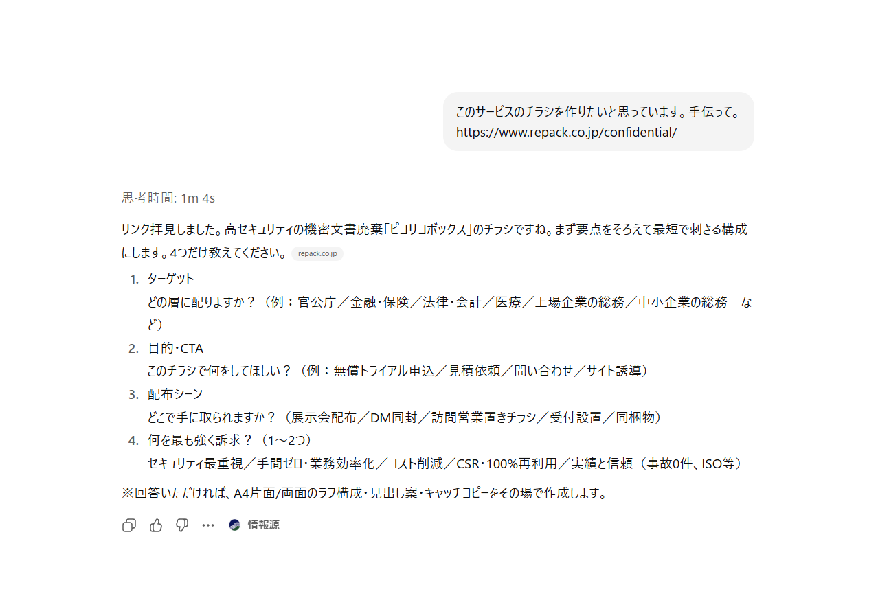 試しに弊社リパックが出している機密書類処理サービス「ピコリコBOX」のURLを貼り付けながらお願いしてみます。