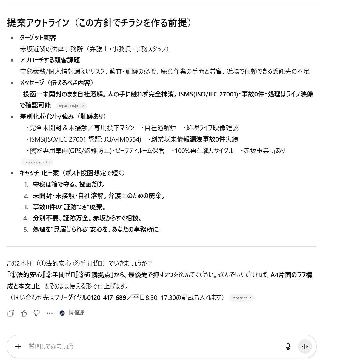 たしかに弁護士事務所ならではの悩みに寄り添った内容、かつ「赤坂近隣」という地理的優位性も含めて訴求することをお勧めしてくれています。