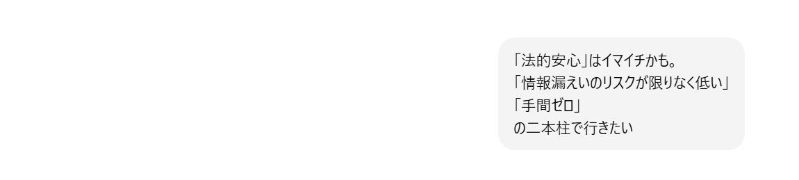 ただ、「法的安心」というよりは「顧客の情報が絶対に漏れない」事の方が弁護士さんには刺さりそうな気がしたので少し修正をしてもらいます。
